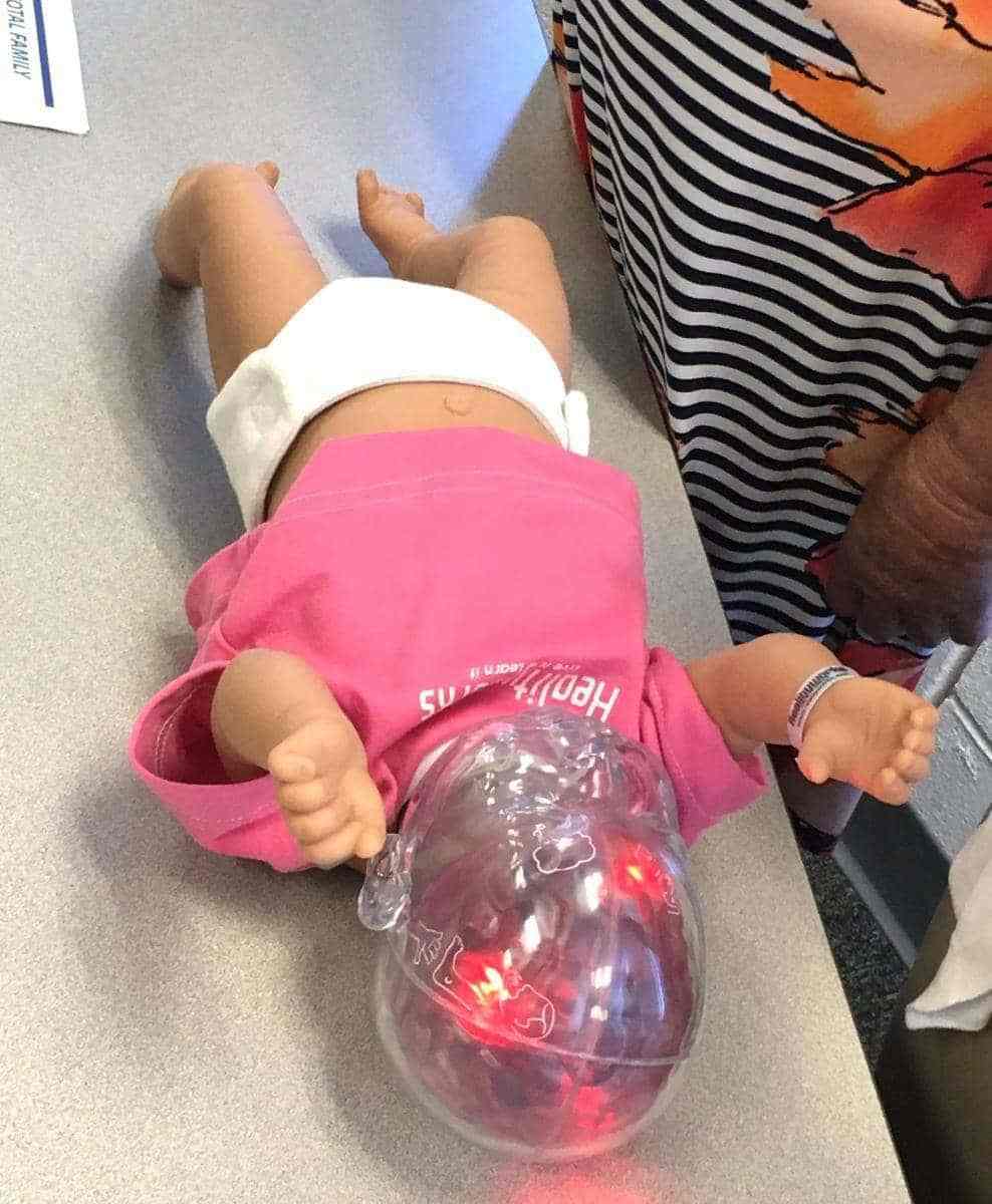 The next hands on station was to teach us more about Shaken Baby Syndrome. To truly demonstrate how easily and quickly shaking a child can damage their brain, the trainers had us each take turns holding a lifelike doll that would cry and scream much like a newborn, and then she asked us to shake it to stop the crying. The head on the doll would light up red to show us the areas of the brain that would be affected by shaking a baby. It was an amazing exercise showing us firsthand how delicate an infant’s head, neck, and brain can be, and how easily a frustrated adult can do permanent damage. The experience was eye-opening and could be an effective tool in working with new parents.