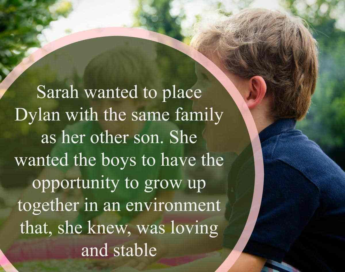 Sarah wanted to place Dylan with the same family as her other son. She wanted the boys to have the opportunity to grow up together in an environment that, she knew, was loving and stable. She struggled with feeling defeated and guilty about not being able to provide for her son, but ultimately, she wanted more for him.